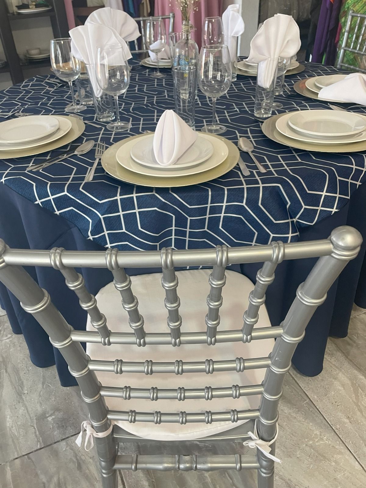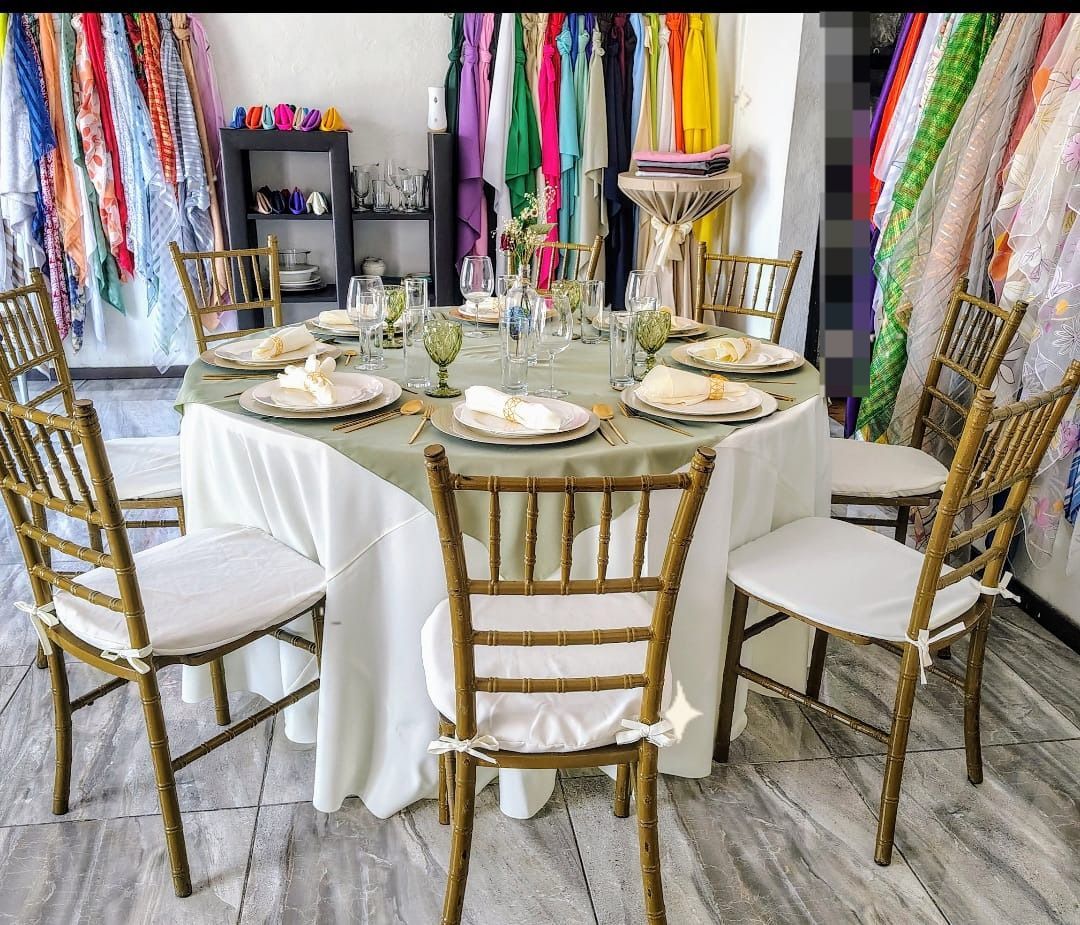 - Sillas: eurosilla (jardinera negra), silla acojinada, Tiffany en color oro, blanca, plata y chocolate